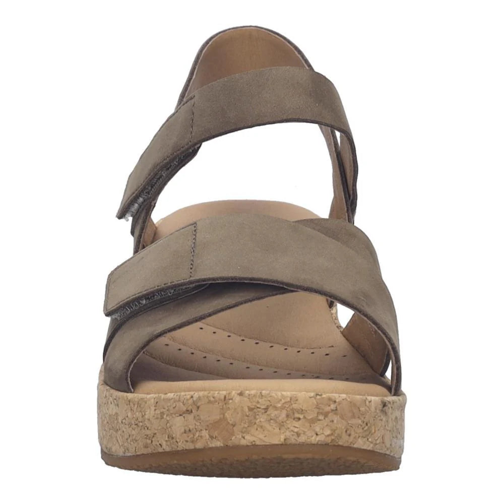 Soft leather upper with crisscross front straps for a secure, flattering fit